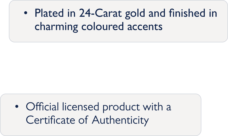 This upgrade coin is plated in 24-Carat gold and features charming coloured accents for each character, making it more valuable and sought-after by collectors than your silver coin.