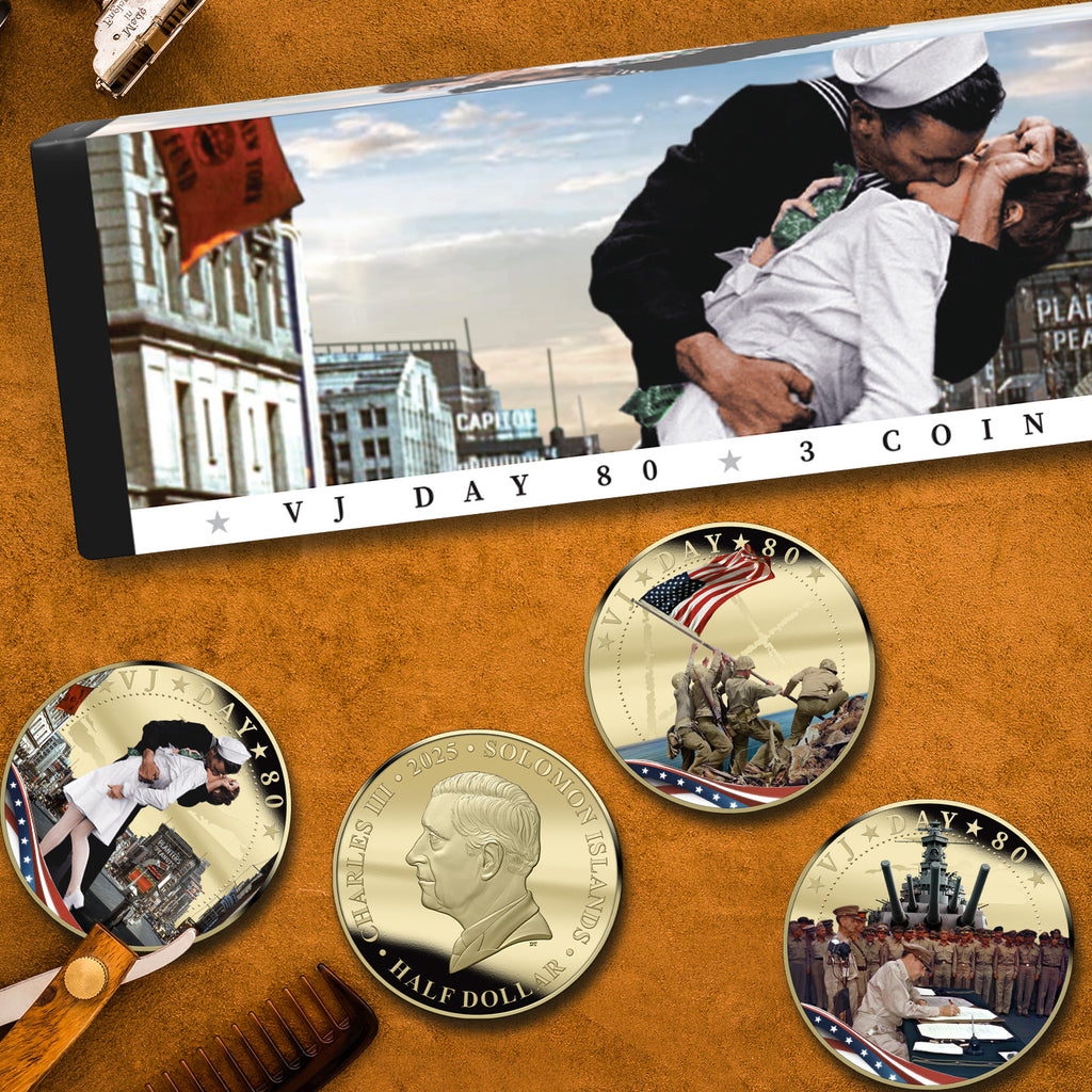 VJ Day – Victory over Japan Day – marks 15 August 1945, when the final surrender brought the global conflict of WWII to a close. This limited-edition collection includes three gold plated legal tender coins, each with a full colour design inspired by key moments from that day: the jubilant Times Square kiss, the raising of the American flag and the official signing of the surrender documents.