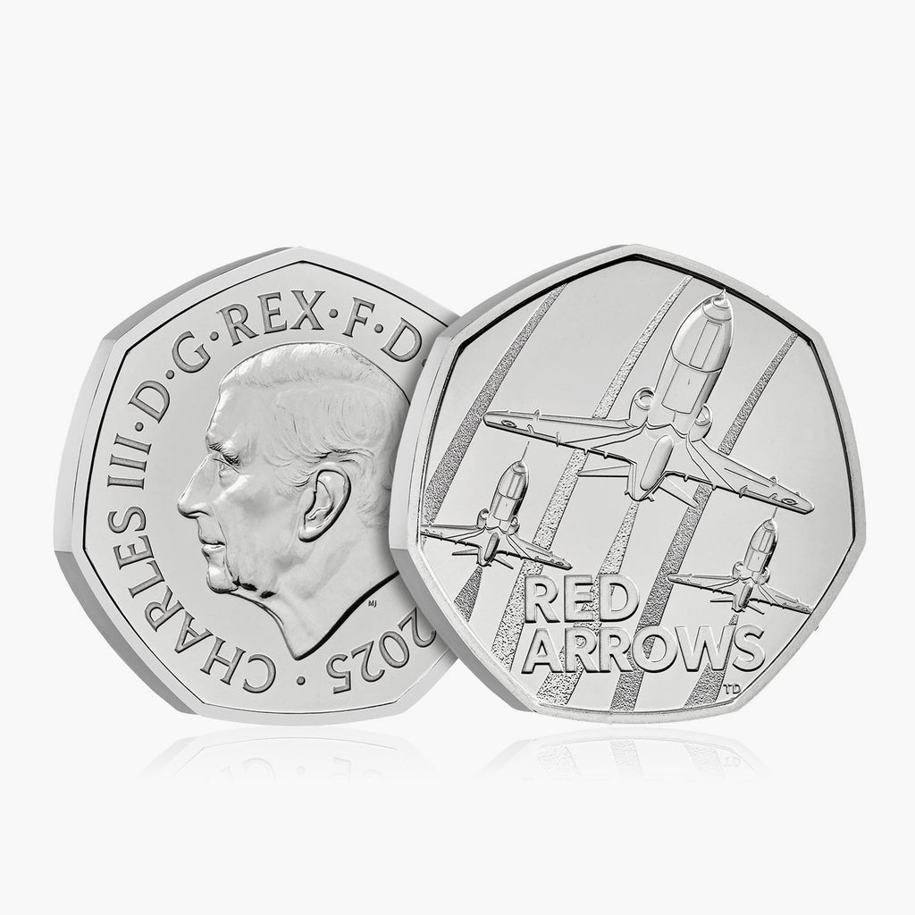 Paying tribute to the iconic Red Arrows aerobatic team, this 50p coin features a dynamic design celebrating their skill, precision, and contribution to British aviation excellence.