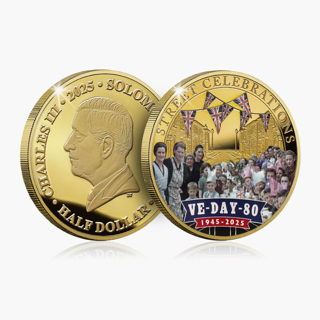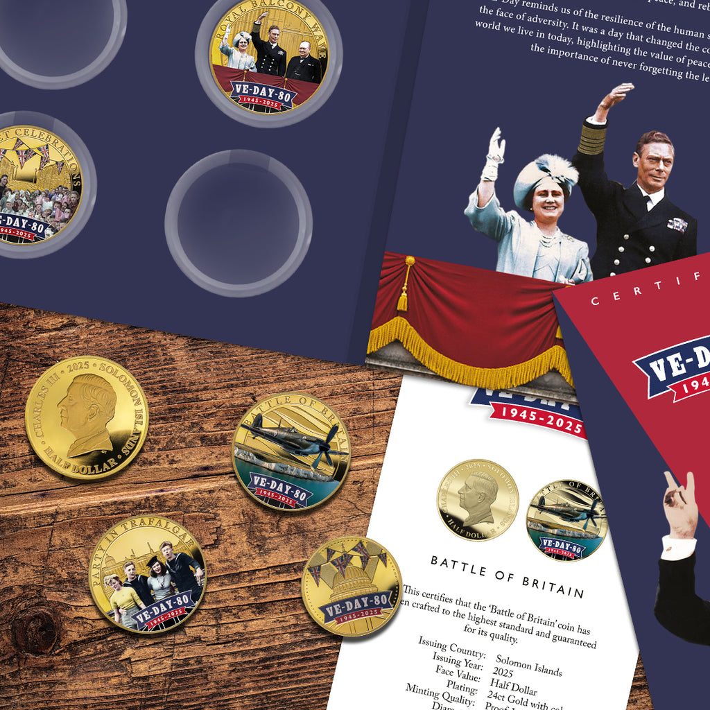 Introducing the 2025 VE Day Gold Plated Coin Collection, a remarkable legal tender series commemorating the iconic moments and heroes of Victory in Europe Day.