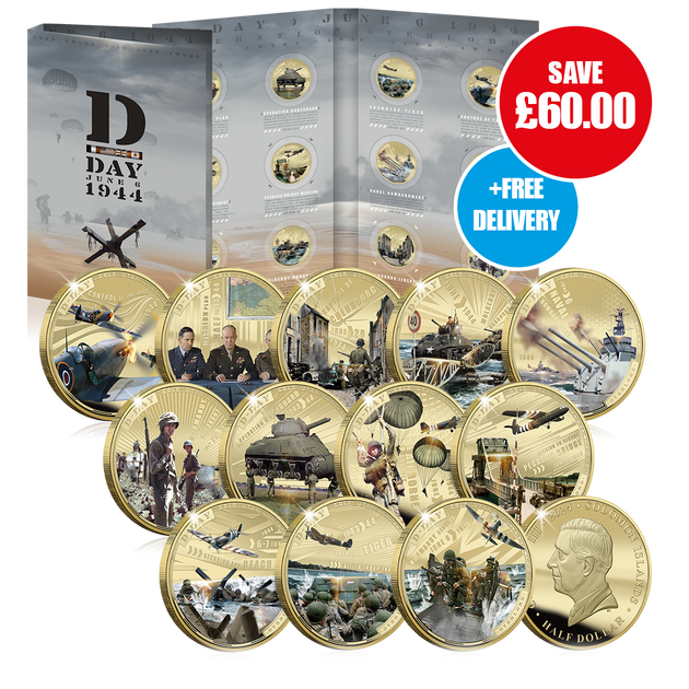 SECURE ALL TWELVE 2024 ISSUE 80TH ANNIVERSARY D-DAY LEGAL TENDER COINS TODAY AND ENJOY A £60.00 SAVING