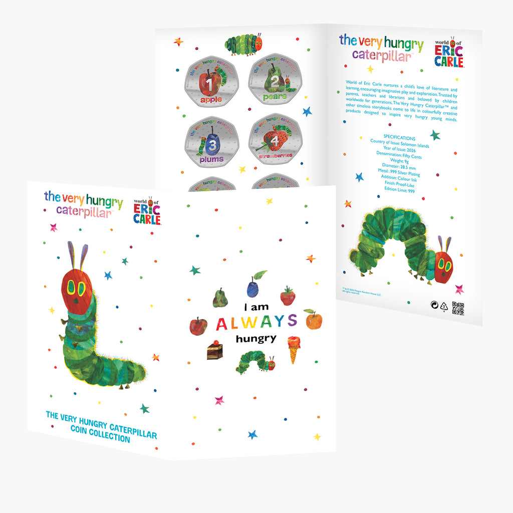 Issued in 2026 on behalf of the Solomon Islands, each coin shares a common obverse and is brought together in a specially designed collector folder themed to The Very Hungry Caterpillar. The result is a joyful and nostalgic collection that brings the story to life through colour and detail.