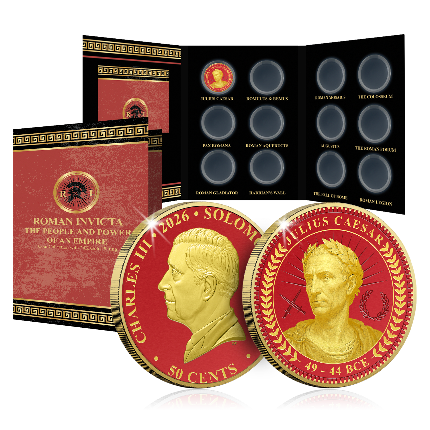 The collection begins with a coin dedicated to Julius Caesar, one of the most renowned leaders in Roman history. Struck to a brilliant uncirculated finish and enhanced with selective gold plating, each coin in this historic series explores a different theme from Roman civilisation, from the rise of emperors and the spread of peace under Augustus, to the strength of the Roman Legion and the architectural feats of the Colosseum and aqueducts.
