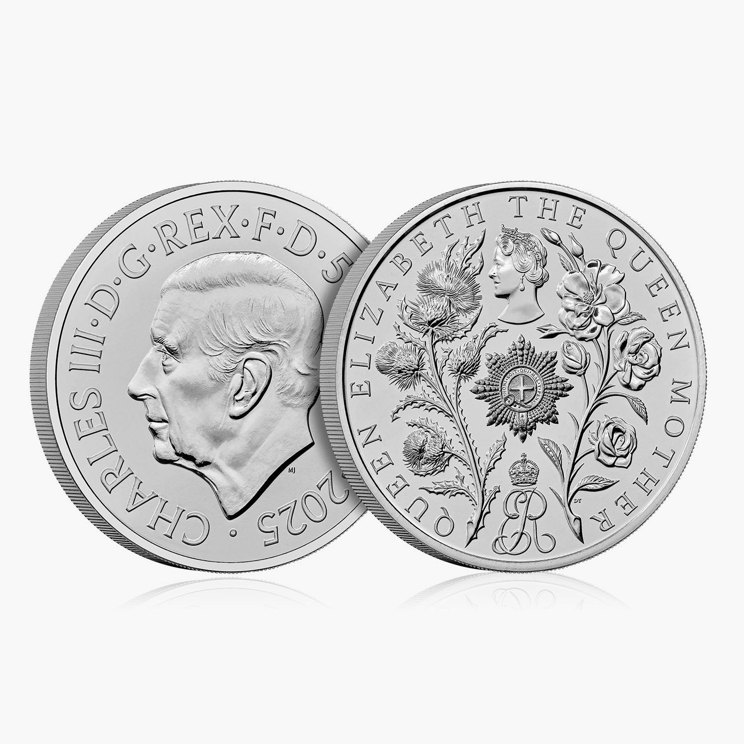 This £5 coin celebrates the life and contributions of the Queen Elizabeth The Queen Mother, with an elegant reverse design commemorating her unwavering dedication and enduring influence on the nation.
