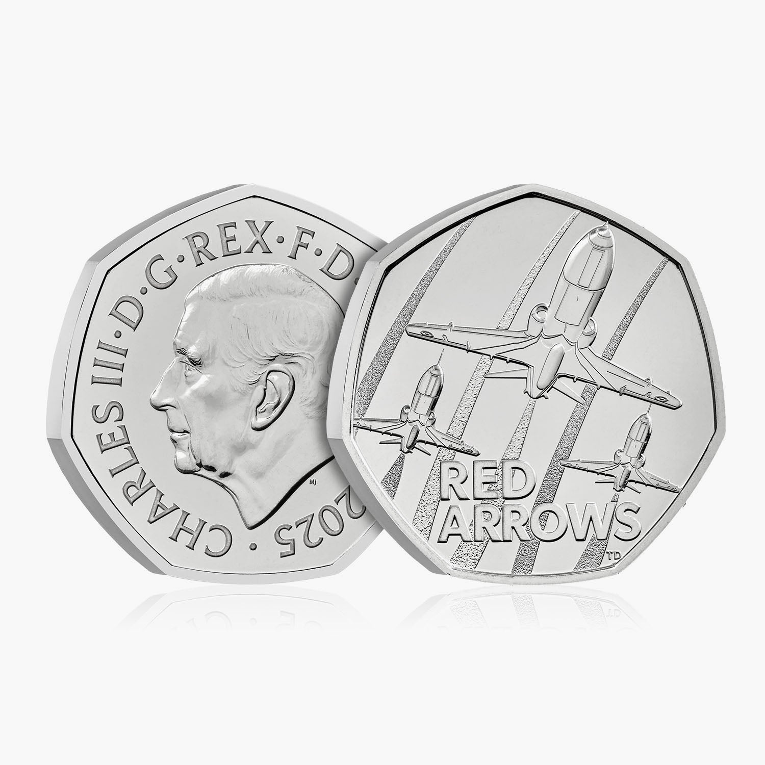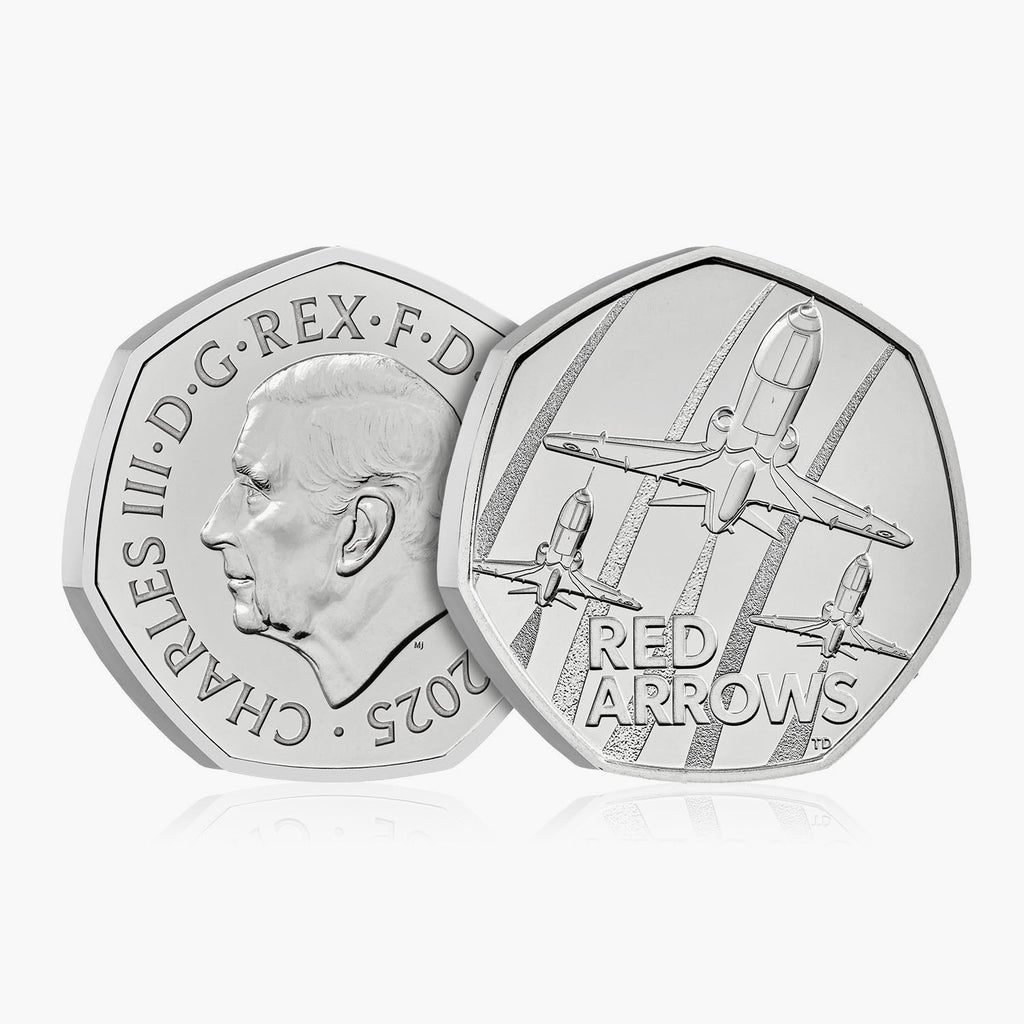 Paying tribute to the iconic Red Arrows aerobatic team, this 50p coin features a dynamic design celebrating their skill, precision, and contribution to British aviation excellence.