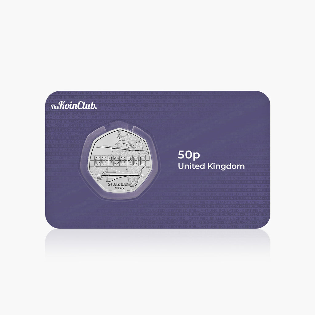 This official 2026 UK 50p coin celebrates 50 years since Concorde’s first commercial flight. Designed by Osborne Ross, the reverse features the aircraft in flight above a stylised globe, with the name CONCORDE shown in the style of a split-flap departure board.