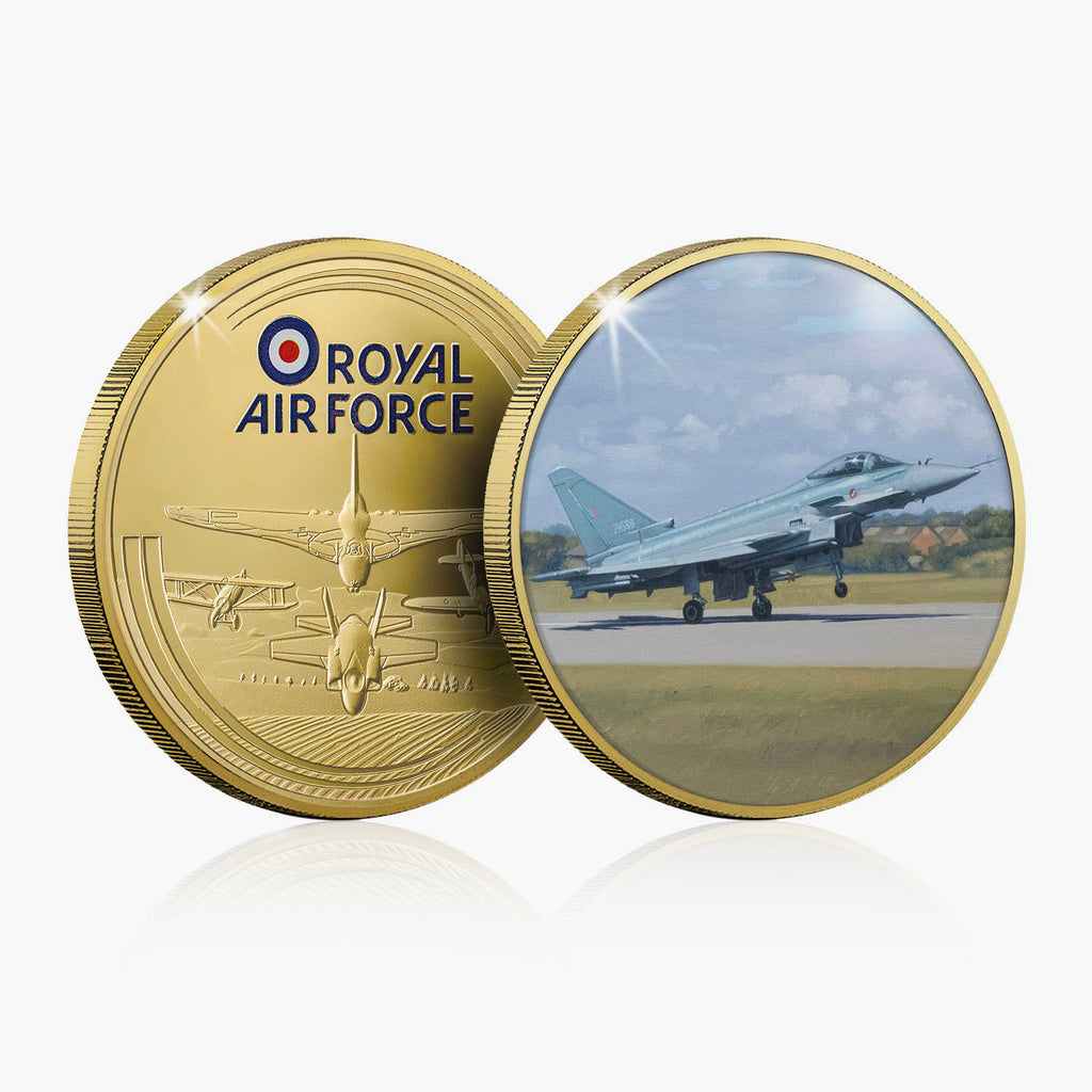 The Eurofighter Typhoon is one of the most iconic and effective operational fighters in the world. Its unique, deliberately unstable design is an instantly recognisable sight and gives the plane an astonishing level of manoeuvrability. Each commemorative in the pack features a specially commissioned painting by leading aviation artist, Alex Hamilton, and is fully plated in 24-carat gold. The four commemoratives, 'Ascent to the Skies', 'Escorting the Bear', 'Fast & Low' and 'Fully Loaded' show the various aspects of the Typhoon, from its first flight, its role as an interceptor and a ground attack aircraft, as well as the fearsome array of weapons it can carry. By ordering the Eurofighter Typhoon Complete Silver Pack, you will receive all four commemoratives in a stunning collector pack with additional information about the aircraft. Order today and you will be directly supporting the Royal Air Force.