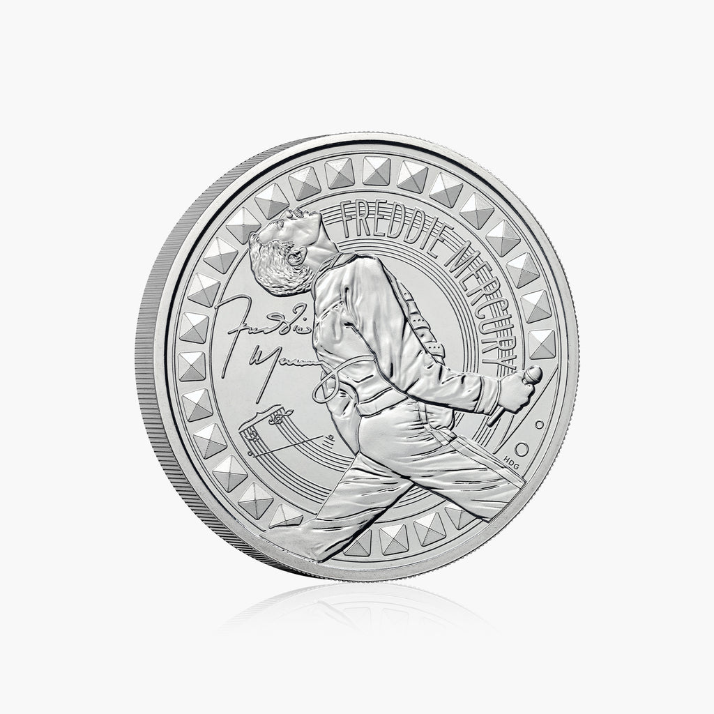 The reverse design features a dynamic depiction of Mercury mid-performance, captured at the height of his stage presence and accompanied by his signature. The image pays tribute to the frontman’s unforgettable charisma and influence on the world of music.