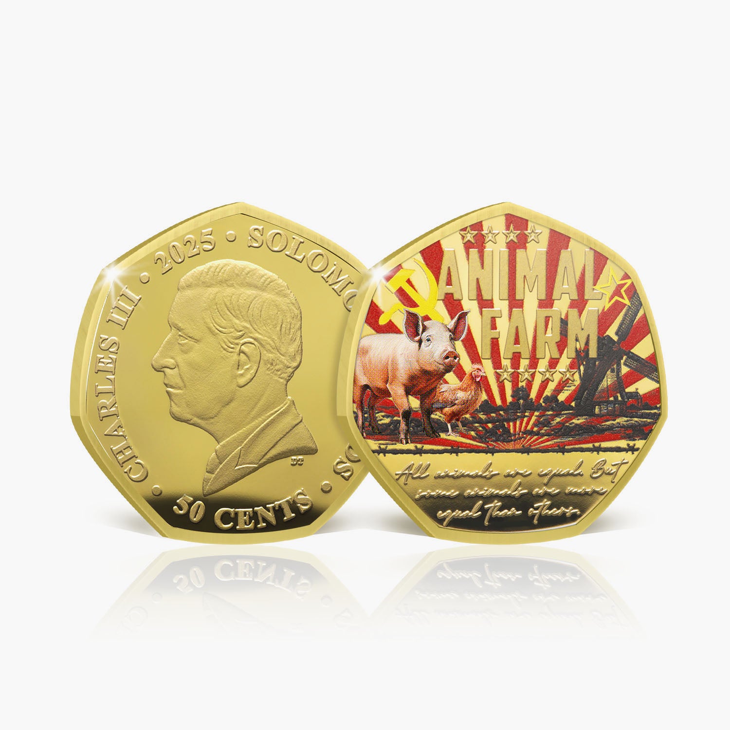 These coins are plated in 24 carat gold, each featuring a unique design inspired by Orwell’s most iconic works: 1984, Animal Farm, and a portrait celebrating his life and literary contributions. Together, they encapsulate Orwell’s exploration of themes such as truth, freedom and the complexities of human nature.