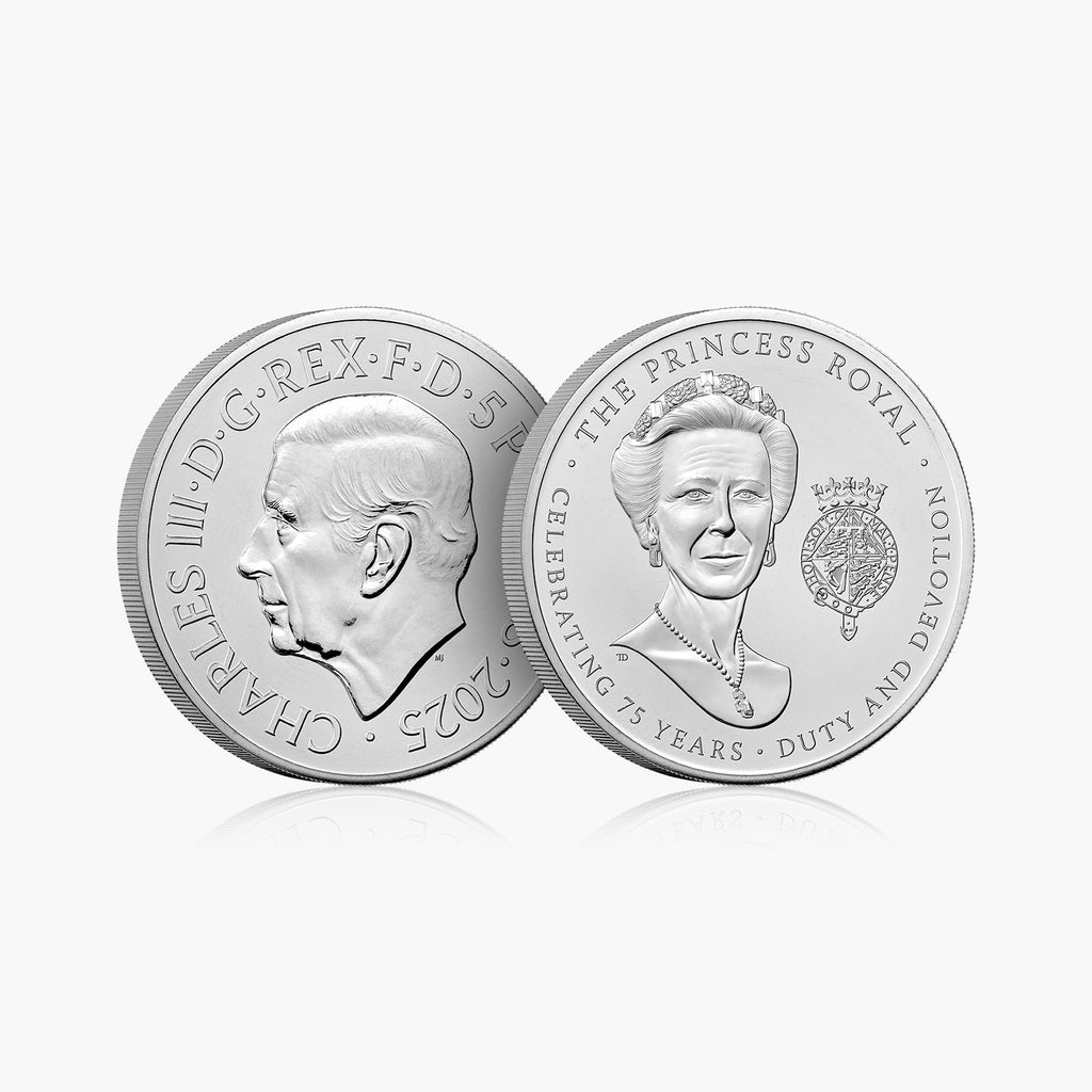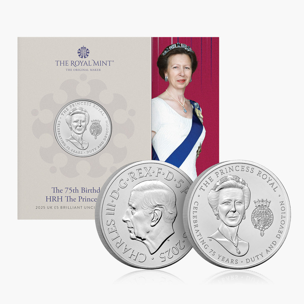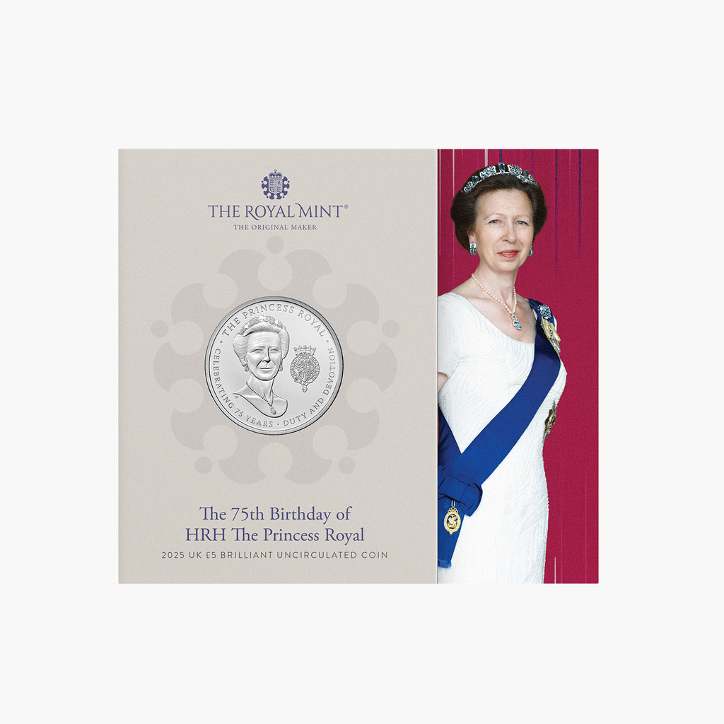 Celebrate the 75th birthday of one of the hardest working royals in modern history with The 75th Birthday of HRH The Princess Royal 2025 UK £5 Brilliant Uncirculated Coin. Struck by The Royal Mint, this is the first UK coin ever dedicated to Her Royal Highness The Princess Royal.