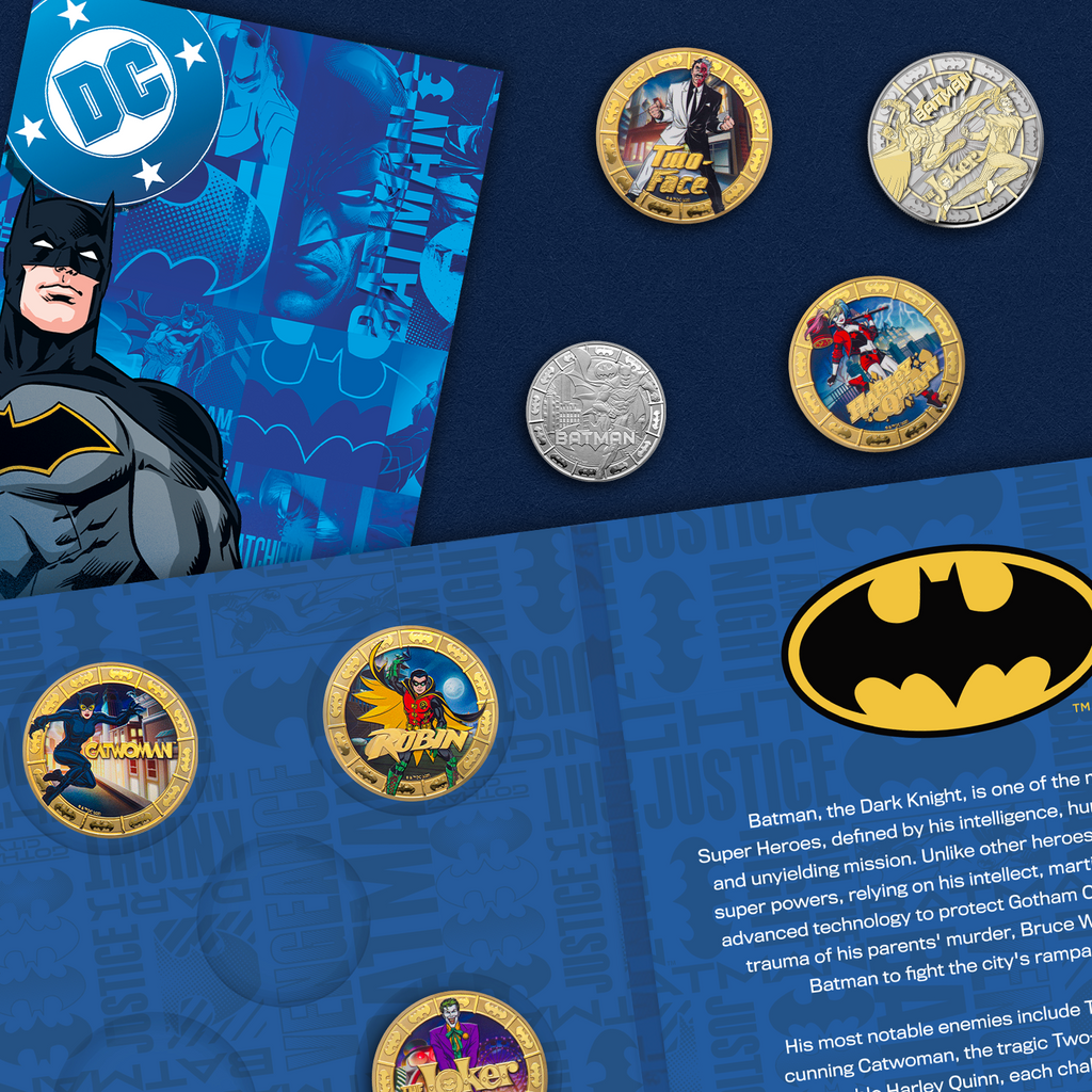 This exclusive set includes the Official Batman Coin presented in a premium collector’s pack, alongside five 24 carat gold plated coins featuring iconic characters: Catwoman, Harley Quinn, Joker, Two-Face and Robin, all captured in full colour detail against a proof-like 24 carat gold plated background.