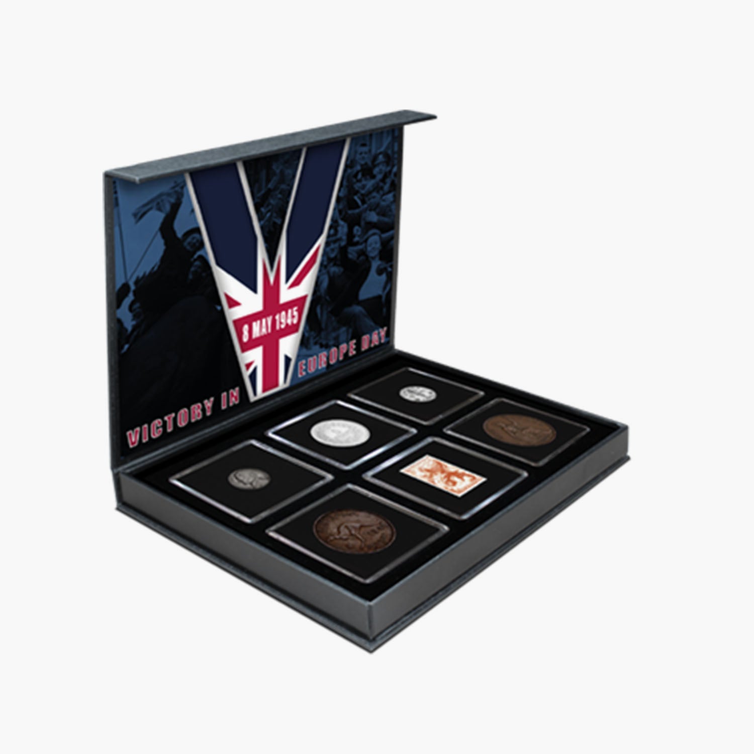 This collection also includes a rare commemorative stamp from 1945, paired with a certificate of authenticity, making it a truly unique piece of history. All items are impressively presented in a premium display box, adorned with VE Day imagery and the iconic Union Jack design.
